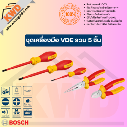BOSCH ชุด รวม ไขควงกันไฟและคีมกันไฟ VDE 5 ชิ้น คีมตัดปากเฉียง/ปากแหลม/ไขควงกันไฟ +ถาด คุณสมบัติเด่น -หุ้มฉนวน เรียบง่าย ใช้สะดวก – ชุดเครื่องมือ VDE จาก Bosch Professional (5 ชิ้น) จุดเด่น -ชุดเครื่องมือ VDE 5 ชิ้น: คีมปากเฉียง 1 ชิ้น (160 มม.), คีมปากยาว 1 ชิ้น (200 มม.) และไขควง 3 ชิ้น SL 3.5 / SL 6.5 / PH 2 -เครื่องมือ VDE ทุกชิ้นผ่านทดสอบถึง 10,000 โวลท์ และผ่านการรับรอง VDE ถึง 1,000 โวลท์ตามมาตรฐาน DIN EN/IEC 60900 -แม่นยำ ทนทาน และใช้งานง่ายด้วยด้ามเครื่องมือทรงเพรียว ด้ามจับแบบนุ่ม และดีไซน์ตามหลักสรีรศ าสตร์