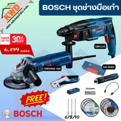 BOSCH ชุดช่างมือเก๋า GBH220+GWS900-100+ฺGO GEN3 KIT ราคาพิเศษยกชุด พร้อมของแถม PRO Q3/2025 ชุดรวมสินค้าจาก BOSCH ของแท้ ลงทะเบียน ONLINE พร้อมขอแถมจัดหนัก จัดเต็ม จากราคาเต็ม 8,654 เหลือ 6,499 ในชุดประกอบไปด้วย 1x BOSCH GBH220 สว่านโรตารี่ 3ระบบ เจาะปูน กระแทก 22มิล 1x BOSCH GWS900-100 เครื่องเจีย เครื่องตัด ลูกหมู ขนาด 4นิ้ว Heavy DUTY 1x BOSCH GO GEN3 KIT สว่านไขควงไร้สาย พร้อมอุปกรณ์ 1x BOSCH ชุด มีดอเนกประสงค์ + ใบมีด 10 ใบ 3x BOSCH ใบตัดเหล็ก ขนาด 4นิ้ว 3x BOSCH ใบเจียเหล็ก ขนาด 4นิ้ว 1x BOSCH ดอกโรตารี่ SDS-Plus-1 6x100/160 1x BOSCH ดอกโรตารี่ SDS-Plus-1 8x100/160 1x BOSCH ดอกโรตารี่ SDS-Plus-1 10x100/160