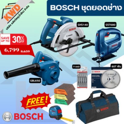 BOSCH ชุดยอดช่าง GKS140+GBL620+GST680 ราคาพิเศษยกชุด พร้อมของแถม PRO Q3/2025 ชุดรวมสินค้าจาก BOSCH ของแท้ ลงทะเบียน ONLINE พร้อมขอแถมจัดหนัก จัดเต็ม จากราคาเต็ม 6,799 เหลือ 8,659 ในชุดประกอบไปด้วย 1x BOSCH GKS140 เครื่องเลื่อยวงเดือน ขนาด 7นิ้้ว 1,400w 1x BOSCH GBL620 เครื่องเป่าลม 620w 1x BOSCH GST680 เลื่อยจิ๊กซอว์ 500 วัตต์ 1x BOSCH GO GEN3 KIT สว่านไขควงไร้สาย พร้อมอุปกรณ์ 1x BOSCH ตลับเมตร 5เมตร 1x BOSCH ใบเลื่อยวงเดือน 7นิ้ว 60ฟัน 3x BOSCH กระดาษทรายฟองน้ำแบบเข้ามุม (หยาบ/กลาง/ละเอียด) 5x BOSCH ใบเลื่อยจิ๊กซอว์ตัดไม้ T144D 1x BOSCH กระเป๋าเครื่องมือช่าง