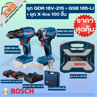 BOSCH ชุด GDR 18V-215 ไขควงกระแทก+GSB 185-LI สว่านกระแทก+ชุด X-line 100 ชิ้น สุดคุ้ม คุณสมบัติ GDR 18V-215 ไขควงกระแทกไร้สาย -เครื่องมือทางเลือกแรกสำหรับงานขันสกรูที่ต้องการความรวดเร็วและแม่นยำ -รวดเร็วและมีประสิทธิภาพ ขันได้แม้แต่สกรูยาวและไม้เนื้อแข็งด้วยมอเตอร์ความเร็ว 3,300 รอบ/นาทีและแรงบิด 215 นิวตันเมตร -ทำงานในพื้นที่แคบได้สะดวก เนื่องจากมีขนาดเล็กและเป็นเครื่องมือไร้สาย -ให้คุณภาพผิวงานดีด้วยโหมดขันอัตโนมัติสองโหมด พร้อมระบบหยุดและลดความเร็วอัตโนมัติ GSB 185LI สว่านกระแทกไร้สาย -ทำงานได้มากขึ้นอย่างไร้ขีดจำกัด -ขนาดกะทัดรัดยิ่งกว่าเดิมพร้อมด้วยมอเตอร์ไร้แปรงถ่านและประสิทธิภาพทรงพลัง -ควบคุมและใช้งานง่ายด้วยดีไซน์ขนาดกะทัดรัด -มอเตอร์ไร้แปรงถ่านประสิทธิภาพสูงช่วยให้ทำงานได้นานขึ้นต่อการชาร์จหนึ่งครั้ง พร้อมทั้งยืดอายุการใช้งานของเครื่องมือ -เปี่ยมประสิทธิภาพด้วยความเร็วในการทำงานสูงสุดถึง 1,900 รอบต่อนาที -เหมาะสำหรับใช้งานในพื้นที่แคบไม่ว่าจะเป็นงานขันสกรูในไม้ หรืองานเจาะไม้ โลหะ และปูน