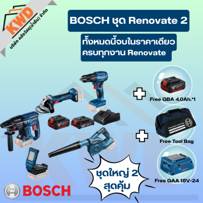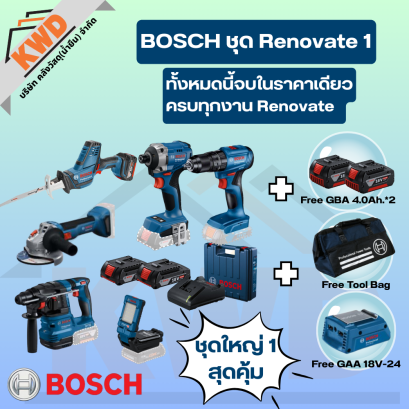 BOSCH ชุด Renovate 1 ครบจบในชุดเดียว พร้อมใช้งาน (ของแท้ประกันศูนย์/พร้อมส่ง) สินค้าที่ได้รับในชุด -Combo Set GDR 18V-215+GSB 185-LI ไขควงกระแทก 18V+สว่านกระแทก18V*1 ชุด -GWS 18V-8 หินเจียรไร้สาย 18V (เฉพาะเครื่อง)*1 เครื่อง -GSA 18V-LI Compact เลื่อยชักไร้สาย (เฉพาะเครื่อง)*1 เครื่อง -GBH 185-LI สว่านโรตารี่ 18V (เฉพาะเครื่อง)*1 เครื่อง -GLI 18V-800 ไฟส่องทำงาน (เฉพาะเครื่อง)*1 เครื่อง ของแถม -แบตเตอรี่ 18V 4.0Ah.*2 ก้อน -กระแป๋าเครื่องมือช่าง*1 ใบ -GAA 18V-24 Adaptor ไฟสำรอง (เฉพาะเครื่อง)*1 เครื่อง
