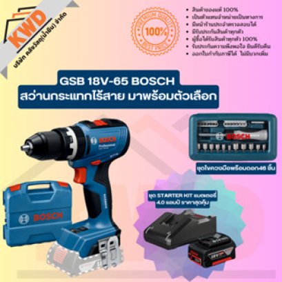 BOSCH GSB18V-65 สว่านไขควงกระแทกไร้สาย พร้อมตัวเลือก คุณสมบัติเด่น -สว่านกระแทกขนาดกะทัดรัดที่มาพร้อมความทนทานตอบโจทย์งานขันสกรูที่ยากลำบาก จุดเด่น -ทำการเจาะสุดหินได้อย่างง่ายดายด้วยแรงบิด 65 นิวตันเมตร -กะทัดรัดและใช้สะดวกในพื้นที่จำกัดด้วยส่วนหัวที่สั้นเพียง 175 มม. -ให้การปกป้องและควบคุมได้อย่างมั่นใจด้วยระบบ KickBack Control -มองเห็นบริเวณการทำงานได้ชัดเจนสูงสุดด้วยไฟส่องพื้นที่ทำงานสองดวง -ประสิทธิภาพทรงพลังจากมอเตอร์ไร้แปรงถ่านแสนทนทานและชุดส่งกำลังที่แข็งแกร่ง