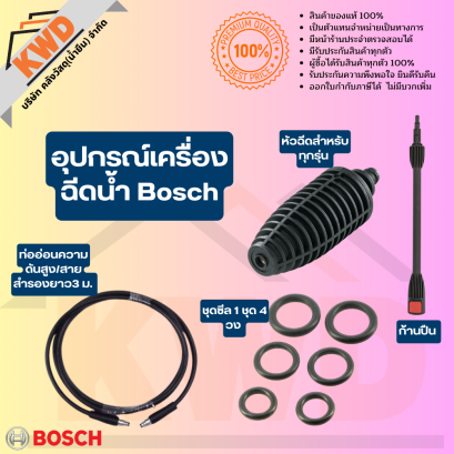 Bosch อุปกรณ์เครื่องฉีดน้ำ EasyAquatak และ Advance Aquatak 1.ชุดซีล 1 ชุด 4 วง สำหรับเครื่องฉีดน้ำ/ปืนฉีดน้ำ 2.ท่ออ่อนความดันสูง/สายสำรองยาว 3 ม. สำหรับเครื่องฉีดน้ำ AQT 33-10 , 33-11 EasyAquatak 100, 110 3.หัวฉีดสำหรับ ทุกรุ่น หัวฉีดแบบควงสว่าน หัวฉีดตรง 4.ก้านปืน สำหรับ EasyAquatak 100, 110, 120 Advance Aquatak 140, 150,