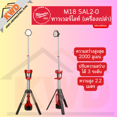Milwaukee M18-SAL2-0 ทาวเวอร์ไลท์ 18 โวลต์ (เครื่องเปล่า) คุณสมบัติพิเศษ -ความสว่างสูงสุด 2800 ลูเมน -ปรับความสว่างได้ 3 ระดับ เพื่อเพิ่มประสิทธิภาพ -สามารถทำงานได้นานสุด 13.5 ชั่วโมง ด้วยแบตเตอรี่ M018HB5 -สามารถปรับมุมฉายแสงได้ -ปรับความสูงได้ระหว่าง 1.1-2.2 เมตร -จุดศูนย์ถ่วงต่ำ เพิ่มความมั่นคง -ทนต่อการกระแทก -กันน้ำกันฝุ่นระดับ IP54