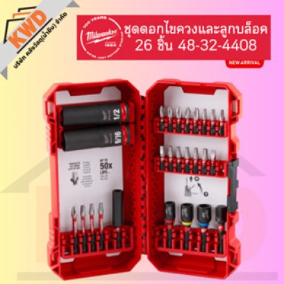Milwaukee ชุดดอกไขควงและลูกบล็อค 26 ชิ้น 48-32-4408 ในชุดประกอบด้วย -SHOCKWAVE™ 1/4" Hex to 3/8" Square Socket Adapter -TORX® บิต 2" T25 -TORX® บิต 2" T20 -TORX® บิต 1" T30 -TORX® บิต 1" T25 -TORX® บิต 1" T20 -บิตสแควร์ 1" SQ2 -บิตสแควร์ 1" SQ1 -SHOCKWAVE™ ที่จับดอกสว่านแม่เหล็กขนาดกะทัดรัด Compact -บิตสแควร์ 2" SQ2 -ฟิลลิปบิต 2" P2 -บิตสแควร์ 1" SQ3 -ดอกไขควงปากแฉก 1" P3 -ฟิลลิปบิต 1" P2 -ดอกไขควงปากแฉก 1" P1 -ดอกกัดเกลียว 1" SL 3/16" -ตัวขับน็อตแม่เหล็ก 5/16" -1/4" ไขควงแม่เหล็ก -อะแดปเตอร์ซ็อกเก็ต 3/8" -3/8" ไขควงแม่เหล็ก