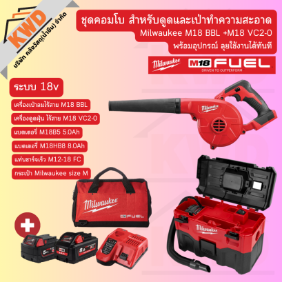 รายละเอียดสินค้าภายในชุด 1x I M18 VC-2-0 เครื่องดูดฝุ่นไร้สาย 18 โวลต์ (เครื่องเปล่า) 1x I M18 BBL-0 เครื่องเป่าลมไร้สาย 18 โวลต์ (เครื่องเปล่า) 1x I แบตเตอรี่ 18 โวลต์ 5.0 แอมป์อาว 1x I แบตเตอรี่ 18 โวลต์ 8.0 แอมป์อาว 1x I แท่นชาร์จแบตเตอรี่แบบ Fast Charge 12-18 โวลต์ 1x I กระเป๋าอเนกประสงค์ Milwaukee size M