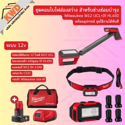 รายละเอียดสินค้าภายในชุด 1x I M12 UHL-0 ไฟหนีบฝากระโปรง/ส่องพื้นที่ 12 โวลต์ (เครื่องเปล่า) 1x I IR HL450 ไฟฉายคาดหัว/หมวก 450 ลูเมน 1x I แบตเตอรี่ 12 โวลต์ 4.0 แอมป์อาว 1x I แท่นชาร์จแบตเตอรี่ 12 โวลต์ 1x I กระเป๋าอเนกประสงค์ Milwaukee size M