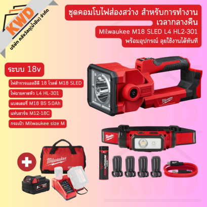 รายละเอียดสินค้าภายในชุด 1x I M18 SLED-0 ไฟสำรวจแอลอีดี 18 โวลต์ (เครื่องเปล่า) 1x I L4 HL-301 ไฟฉายคาดหัว แอลอีดี 1x I แบตเตอรี่ 18 โวลต์ 5.0 แอมป์อาว 1x I แท่นชาร์จแบตเตอรี่ 12-18 โวลต์ 1x I กระเป๋าอเนกประสงค์ Milwaukee size M